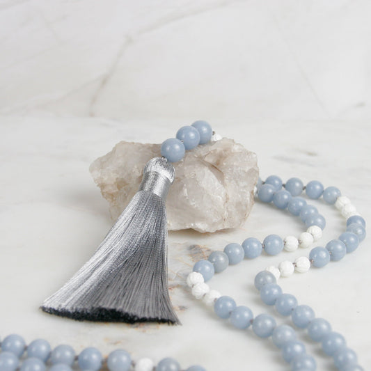 Angelite Mala Necklace with White Lotus Accents