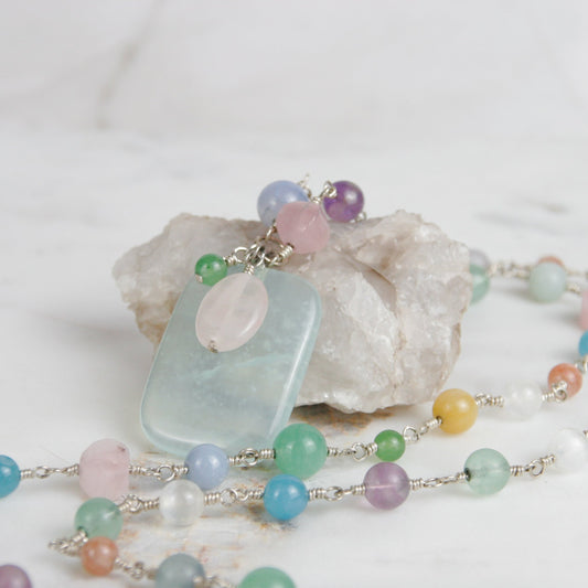 Silver and Pastel Stone Necklace with Green Fluorite Pendant