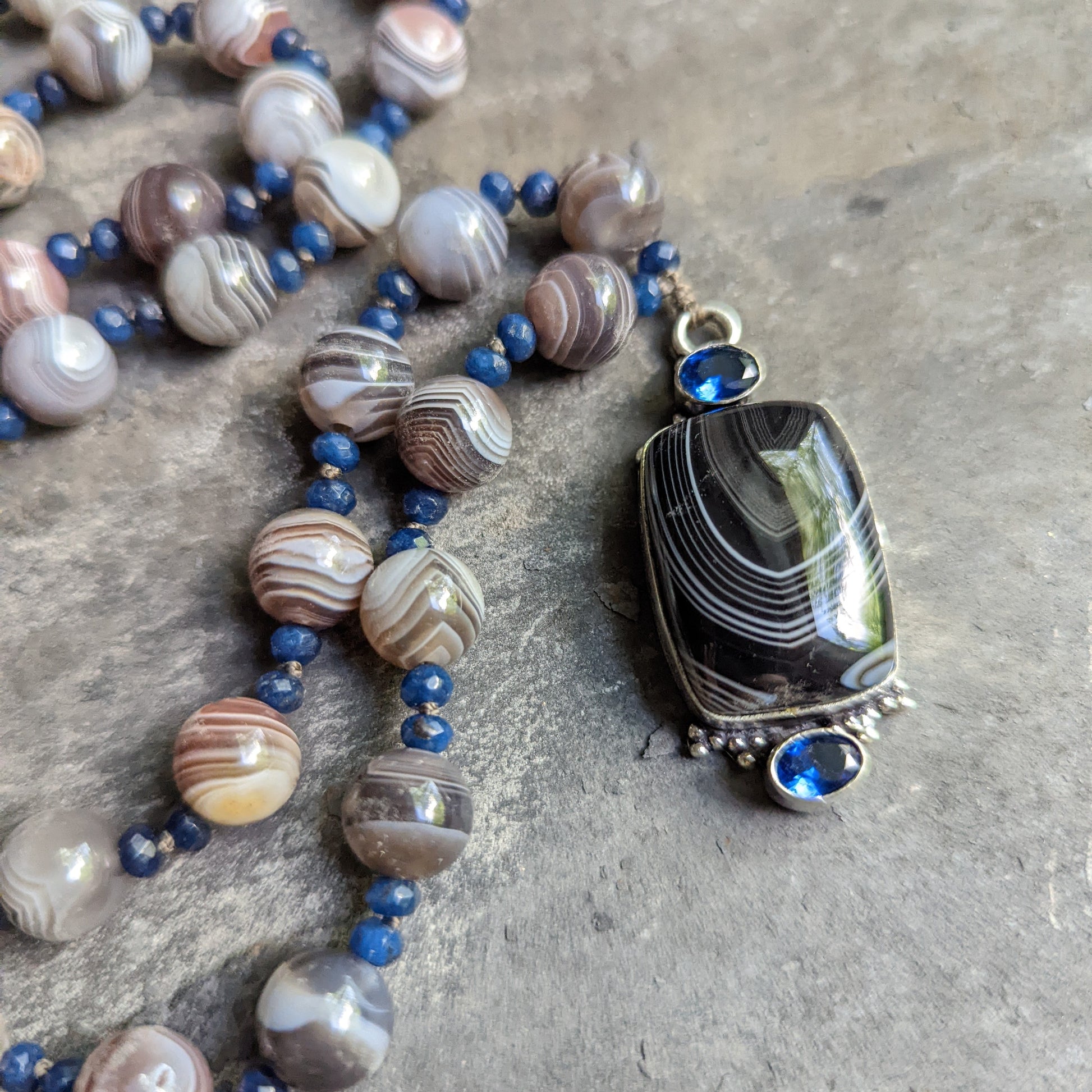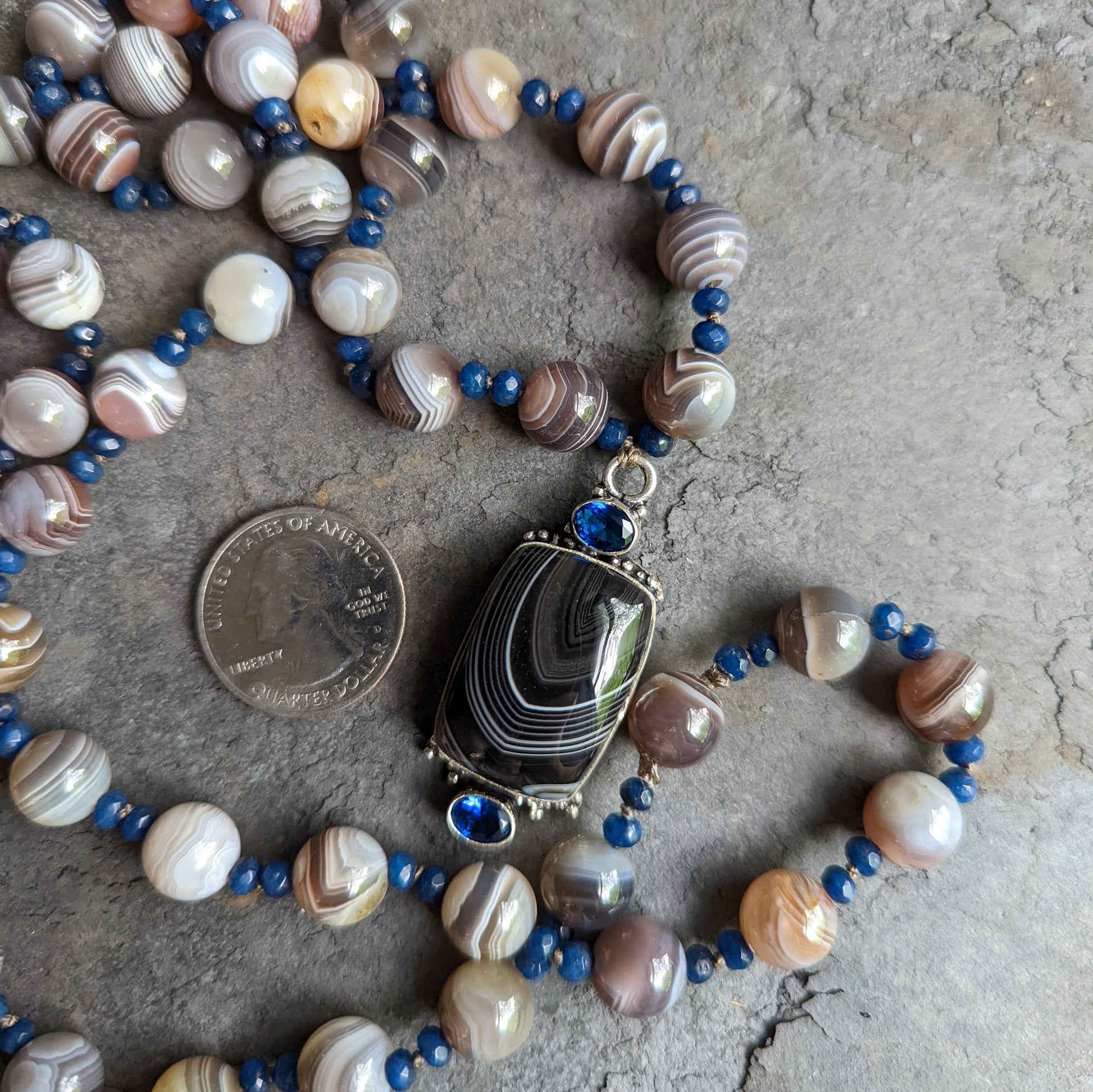 Expertly crafted and stunningly beautiful, our midlength sapphire and Botswana agate necklace is a must-have accessory. Made from AAA grade faceted sapphires and AA grade Botswana agate, this hand-knotted necklace is designed to elevate any outfit. The sterling silver pendant, featuring a combination of Botswana agate and sapphire, adds a touch of elegance and sophistication.