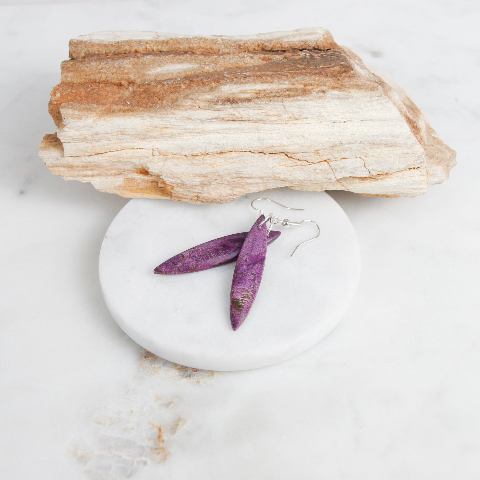 Elevate your elegance with these African Purple Stone Earrings, featuring stunning Atlantisite gemstones known for their rich, deep hues. Paired with refined sterling silver hardware, these dangle earrings offer a graceful movement that complements any sophisticated ensemble. Perfect for adding a touch of natural beauty and unique color to your collection.
