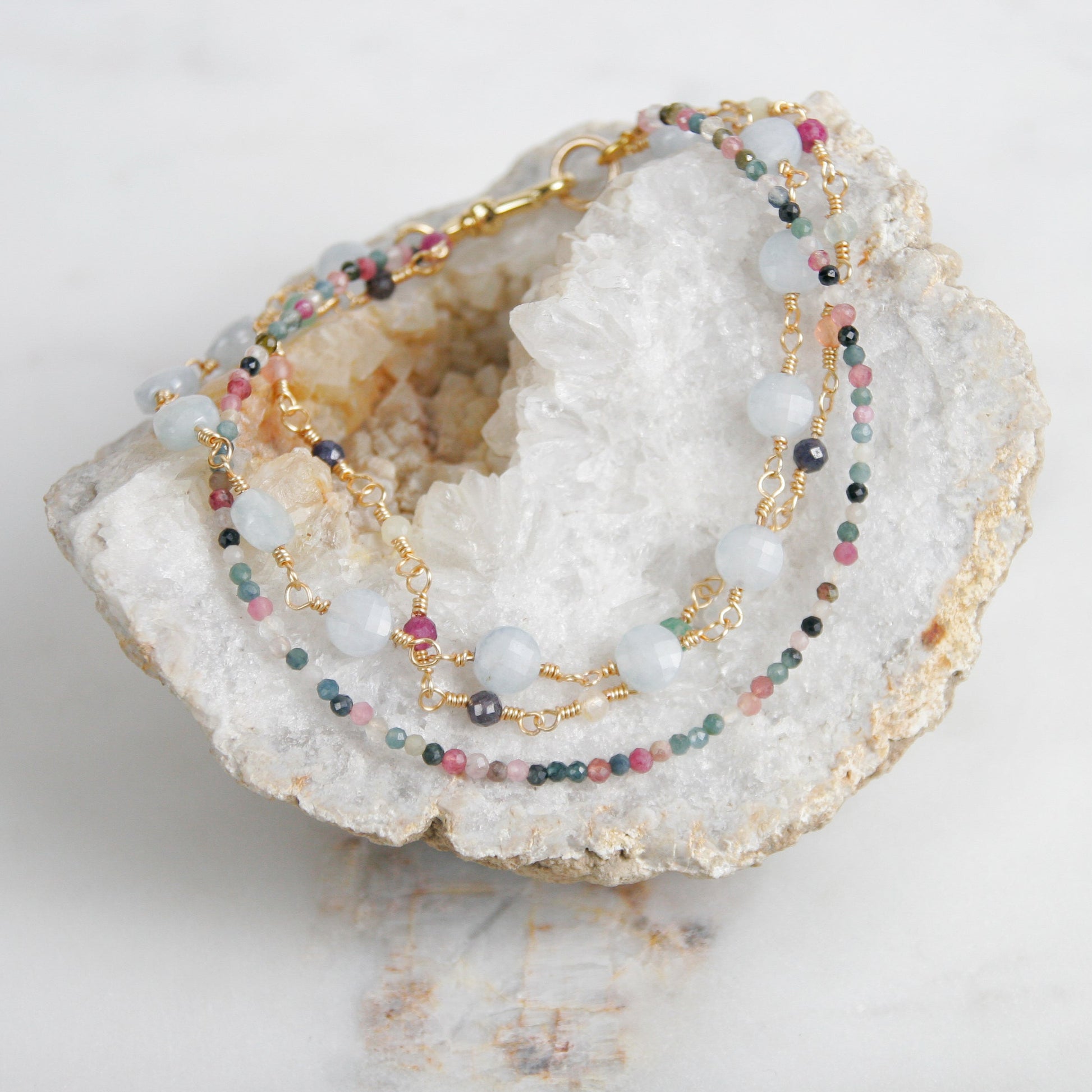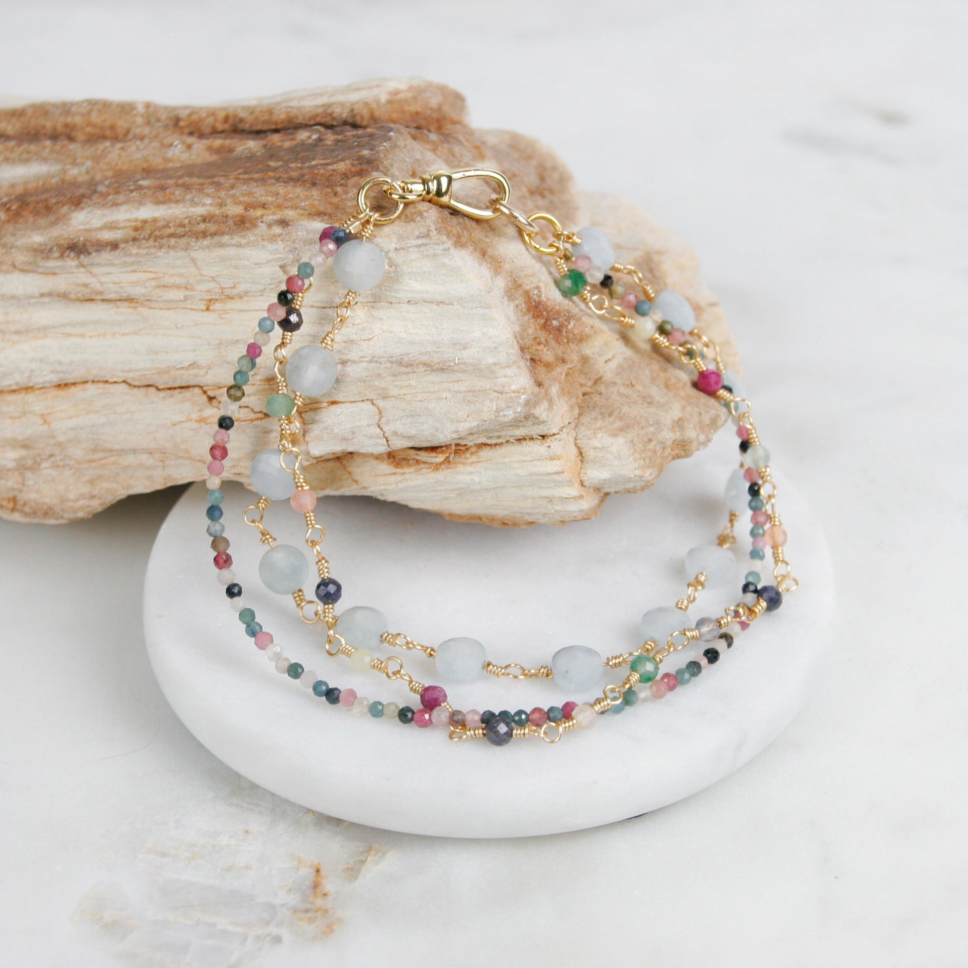 This exquisite multistrand bracelet features shimmering aquamarine and vibrant rainbow tourmaline beads, expertly hand-wired with gold-filled hardware. Its delicate design offers a refined elegance, making it a versatile accessory that enhances both casual and formal ensembles with a subtle yet sophisticated touch.