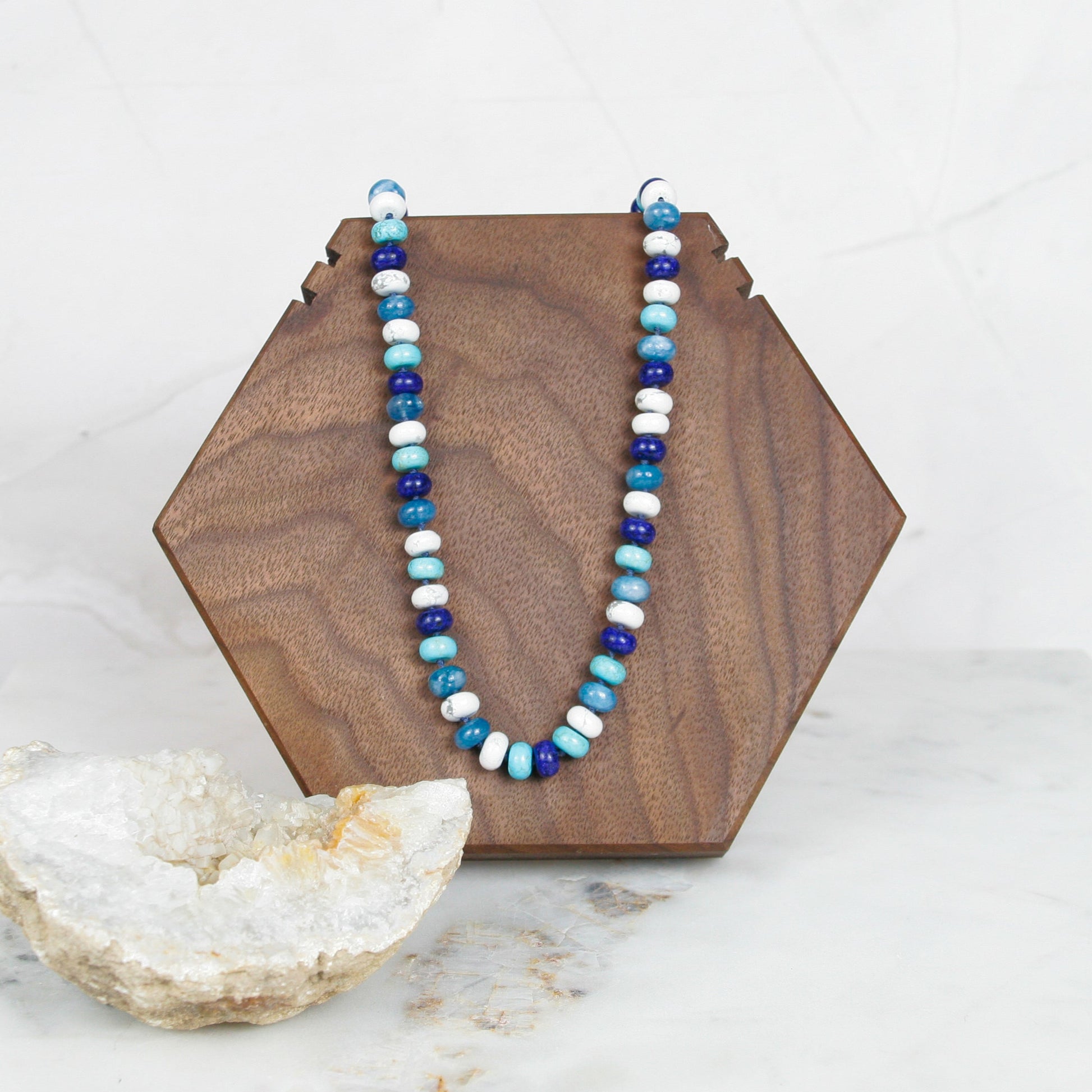Crafted with expert precision, this Beautiful Blues Necklace features a harmonious blend of jade, howlite, lapis, and fossilized coral beads. Each bead is hand-knotted on durable navy cord, ensuring both strength and elegance. Sterling silver fixtures add a refined finish, making this necklace a sophisticated accessory that complements a variety of styles with natural beauty and timeless appeal. 9.5 inches in length.