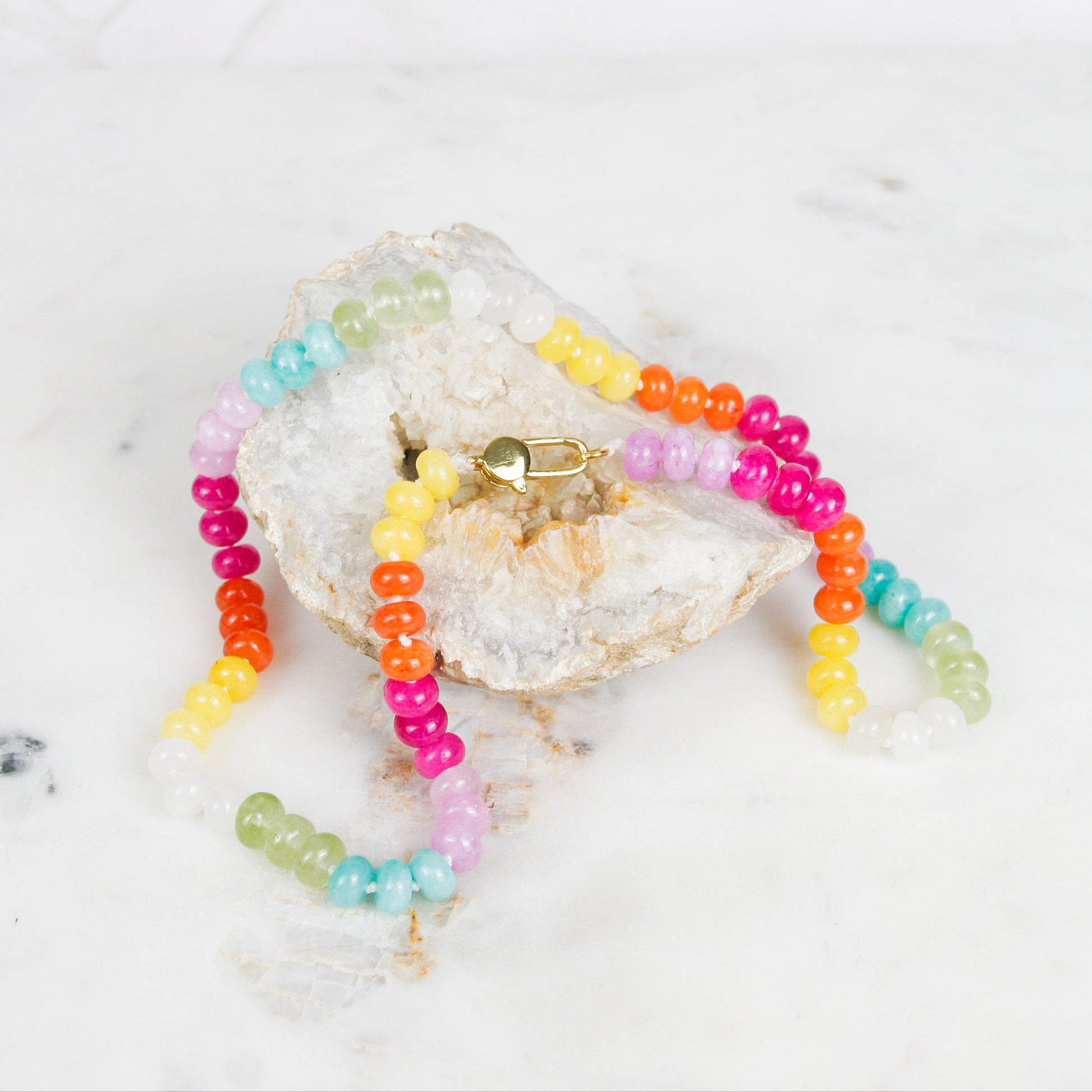 This Bright Candy Jade Necklace features vibrant jade beads expertly hand-knotted on durable white cord, ensuring both strength and elegance. Accented with gold-filled fixtures, it offers a refined finish that complements the lively colors of the beads. Perfect for adding a sophisticated yet playful touch to any outfit.