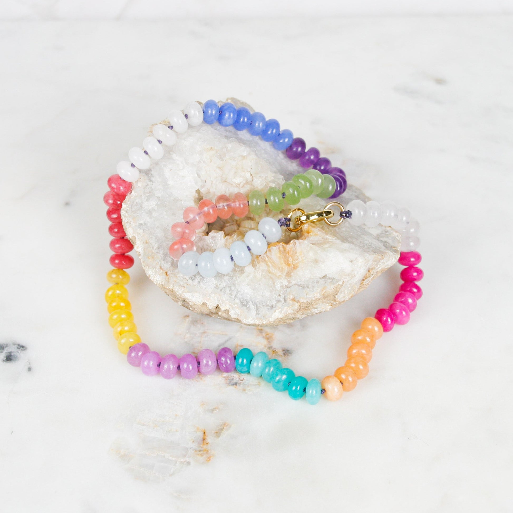 Crafted with expert precision, this Bubble Gum Jade Necklace features hand-knotted jade beads strung on vibrant purple thread, accented by a gold-filled clasp for lasting quality. The playful candy-colored beads bring a fresh, sophisticated pop of color, making it a versatile accessory that elevates both casual and refined looks.