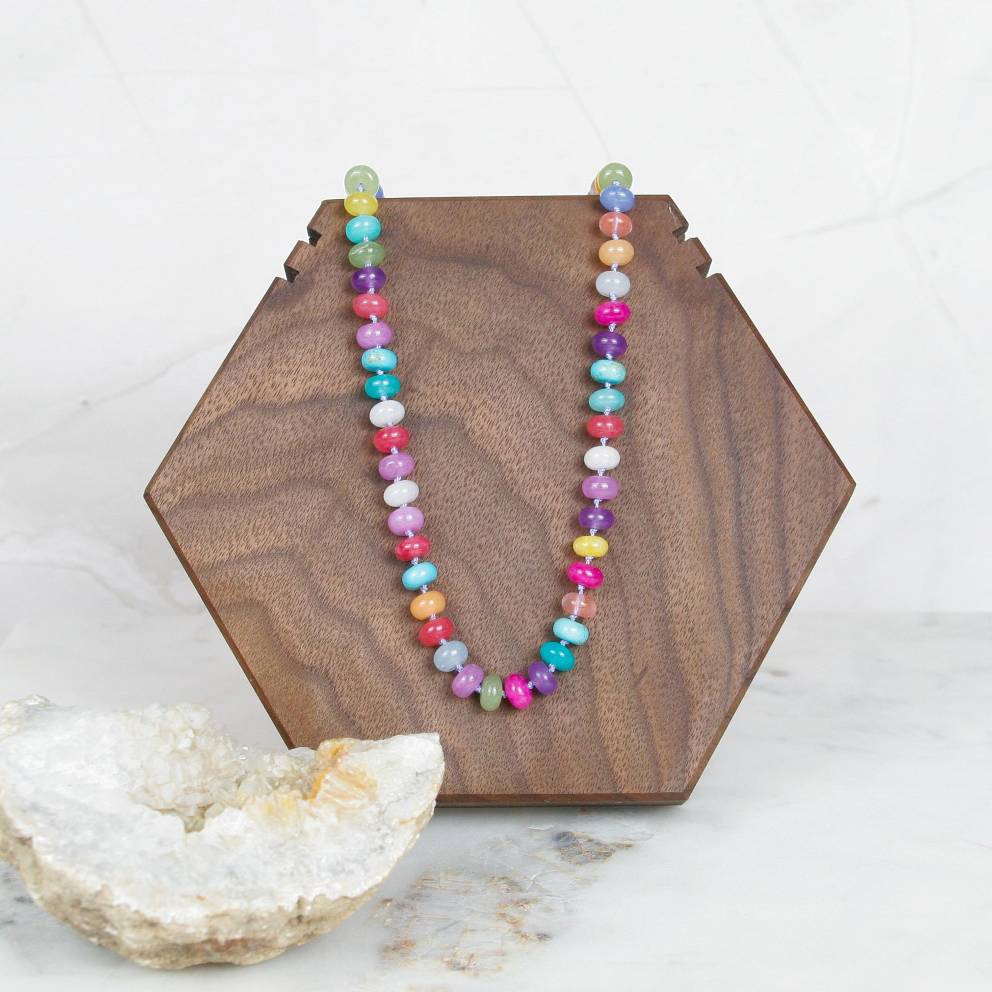 This Candy Jade and Howlite Necklace features bright candy-colored beads crafted from jade and howlite, hand-knotted with a delicate light purple cord for durability and elegance. Accented with gold-filled fixtures, it offers a refined finish that enhances both style and longevity. Perfect for adding a sophisticated pop of color to any outfit. 10 inches in length.
