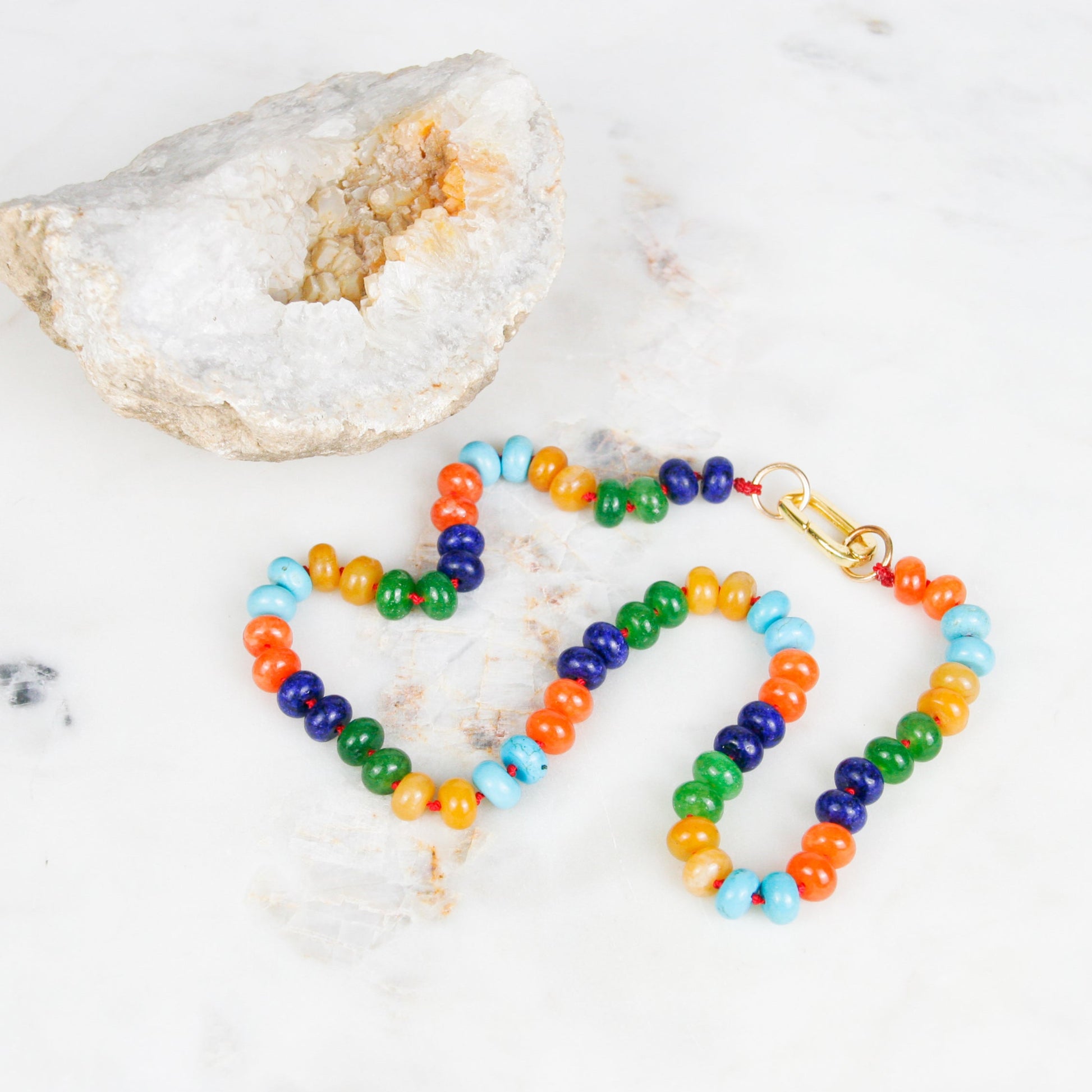 This Funky Lapis Necklace features hand-knotted beads of howlite, jade, and lapis lazuli strung on vibrant red cord. Gold-filled fixtures add a refined touch, balancing the necklace’s bold, colorful design with expert craftsmanship. Perfect for those seeking a unique accessory that combines natural stones with artistic flair. 8.5 inches in length.