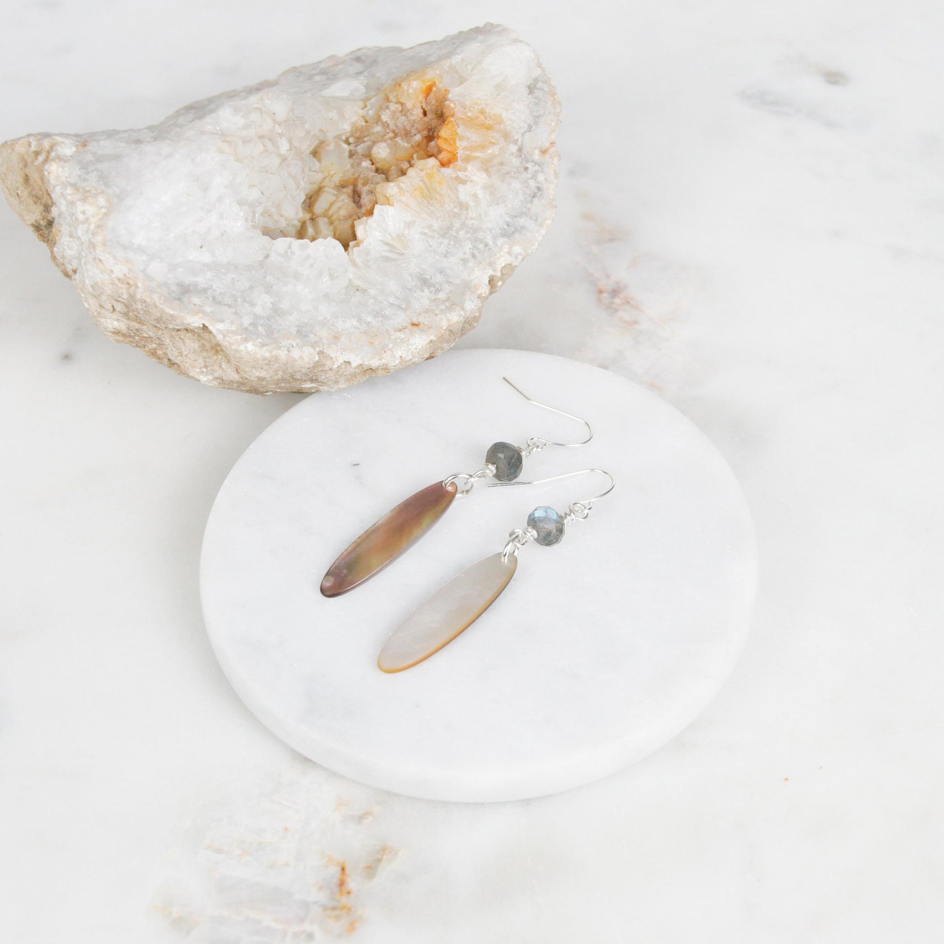 These Iridescent Shell Earrings feature natural flash gray shells paired with faceted labradorite beads, showcasing a captivating iridescent shine. Crafted with sterling silver hardware, they offer both durability and elegance, making them a refined choice for those seeking subtle yet sophisticated jewelry.