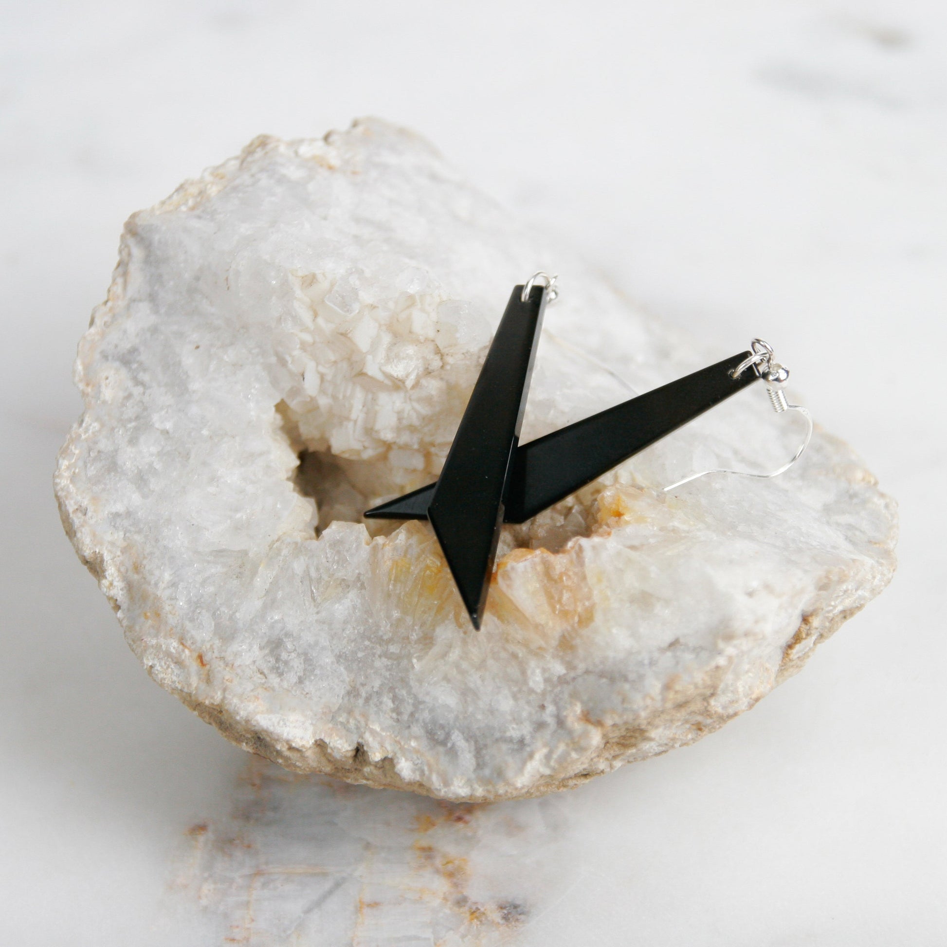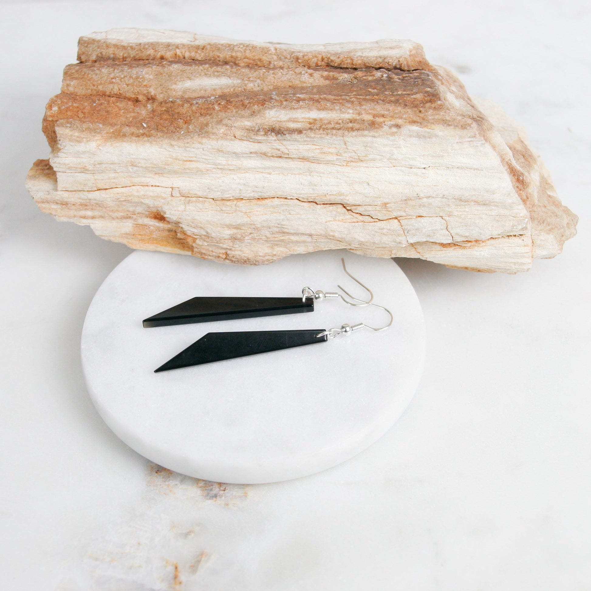 Crafted from natural obsidian, these earrings showcase a unique striking shape that highlights the stone’s deep, rich black hue. Paired with sterling silver hardware, they combine durability with refined elegance, making them a sophisticated choice for those who appreciate distinctive, high-quality jewelry.