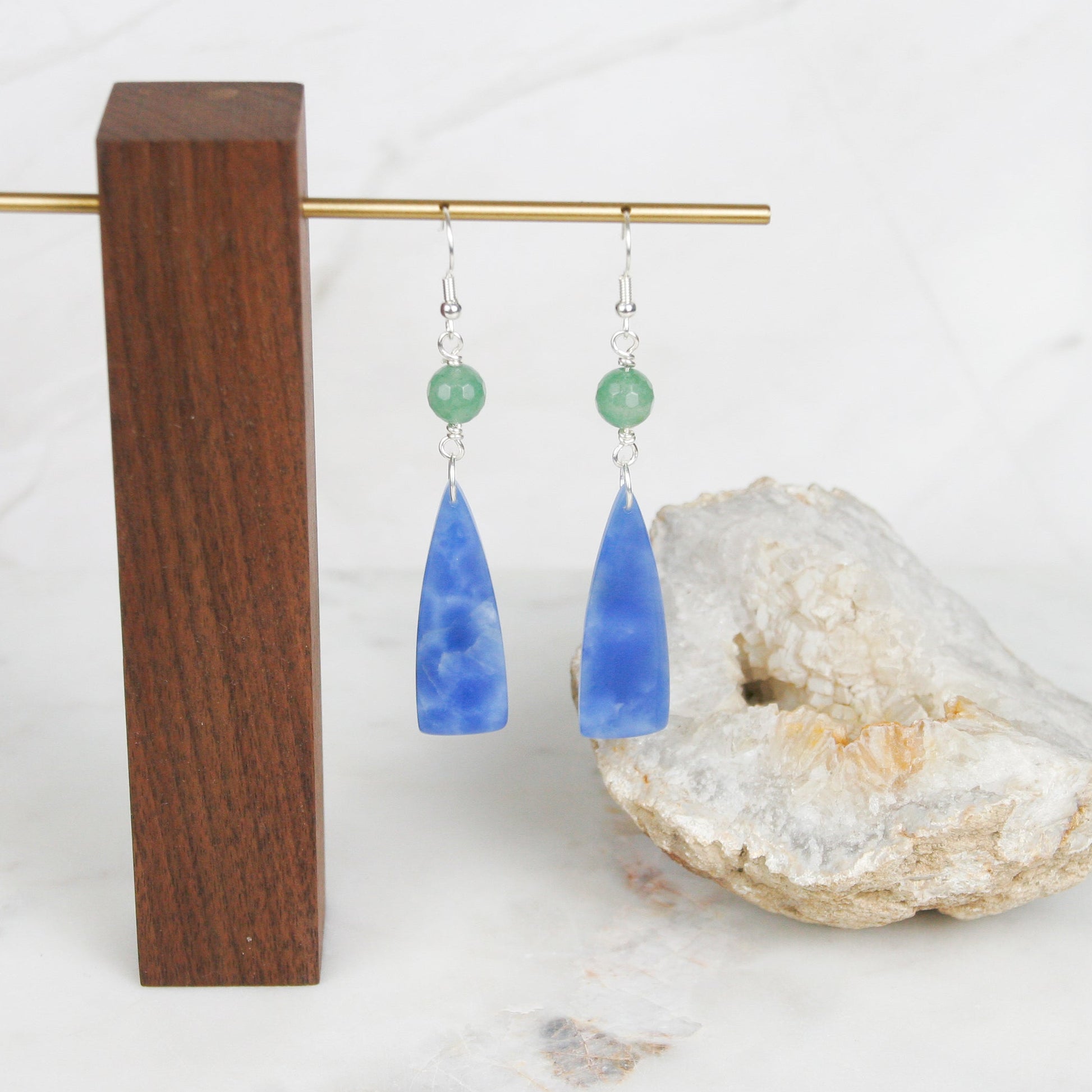 Make a splash with the Ocean Blue Onyx Earrings! These playful earrings showcase stunning blue onyx stones with an ocean wave pattern, complemented by sparkling faceted aventurine beads and sleek sterling silver hardware. They’re the perfect accessory to bring a fun vibe to any outfit.