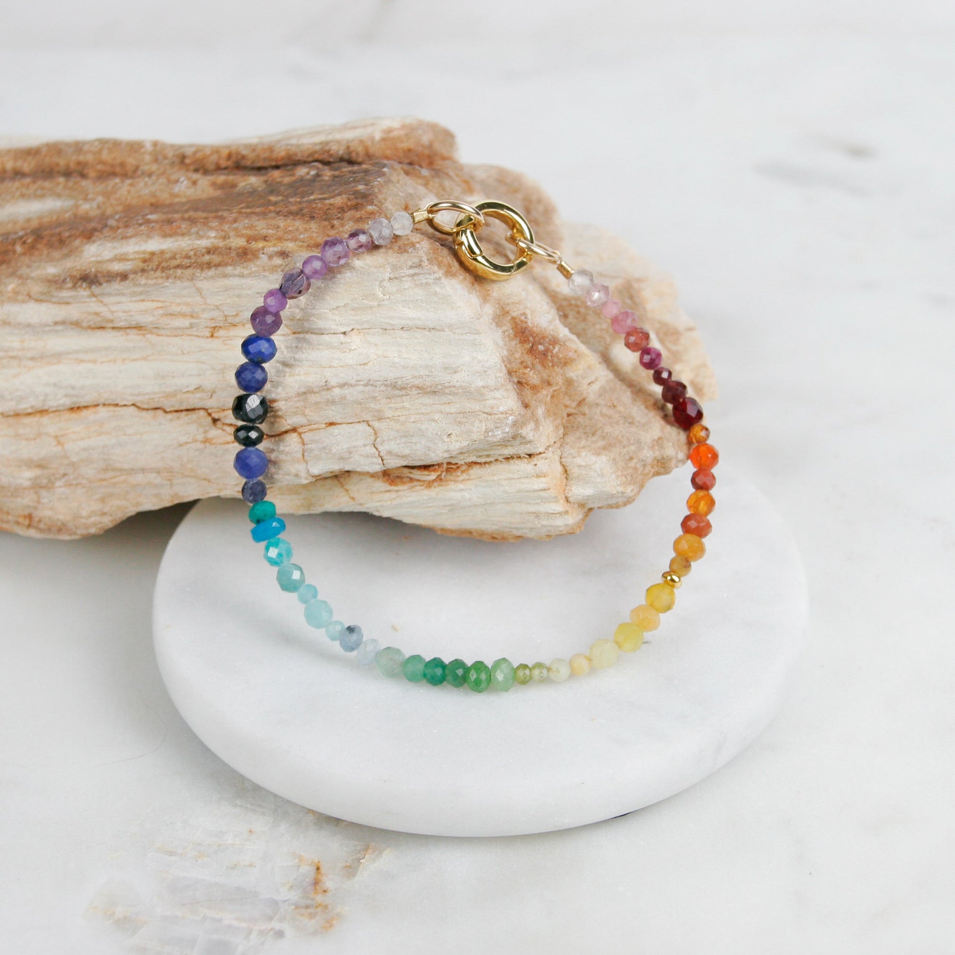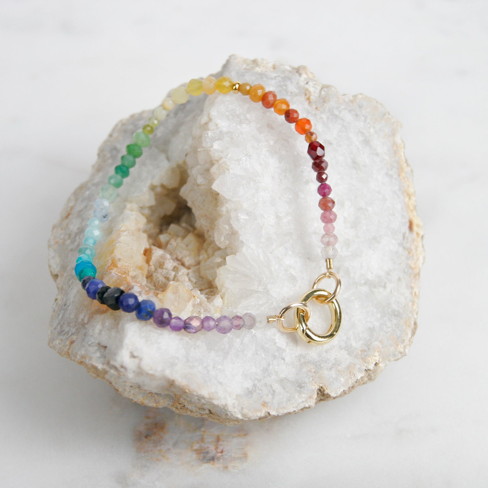 This Rainbow Gemstone Bracelet showcases a sophisticated blend of lapis, aquamarine, garnet, rainbow tourmaline, citrine, amethyst, and additional carefully selected stones. Crafted with gold-filled hardware and a secure closure, it combines durability with elegance. The sparkling gemstones create a vibrant, refined accessory that complements both casual and formal styles with expert precision. - 8 inches in length.