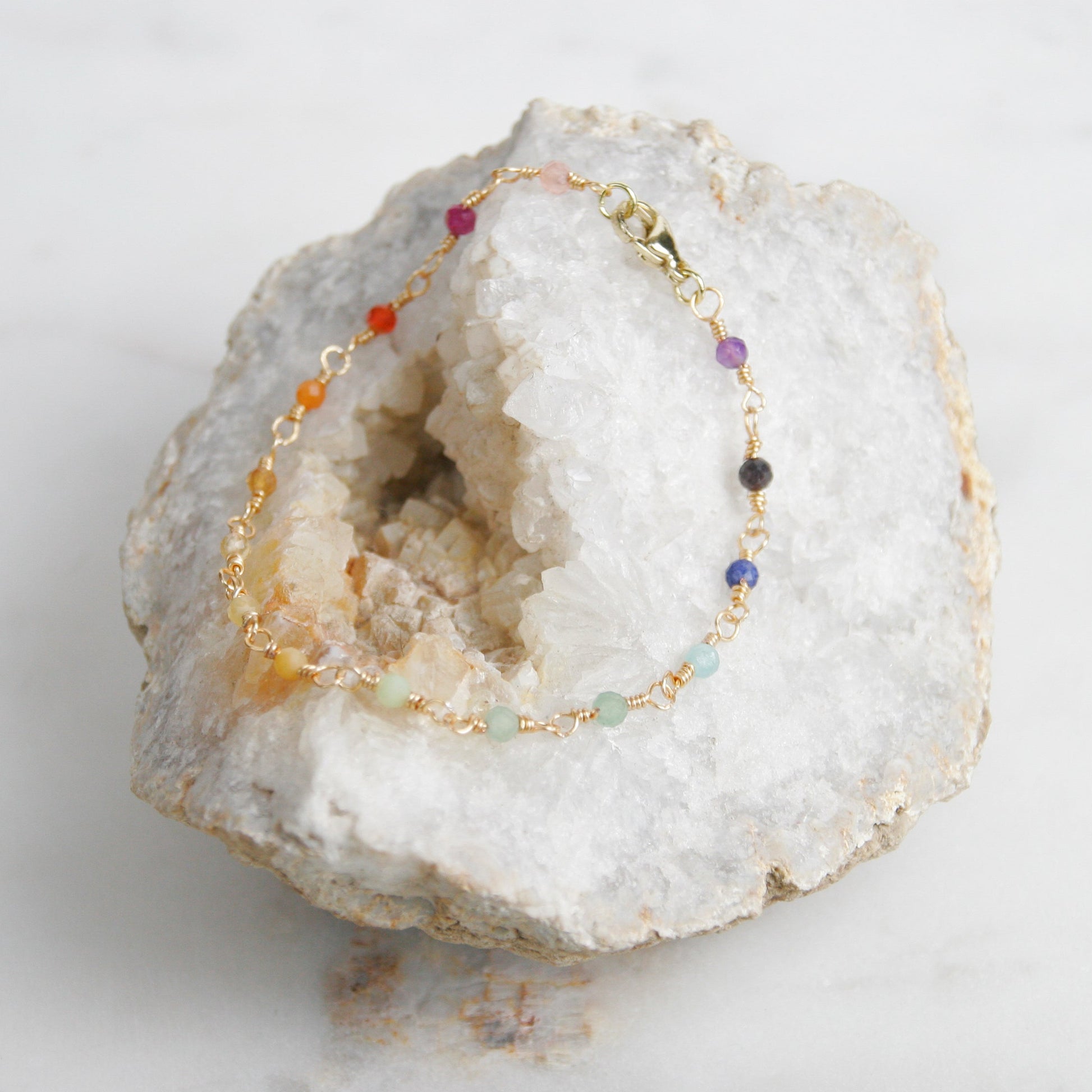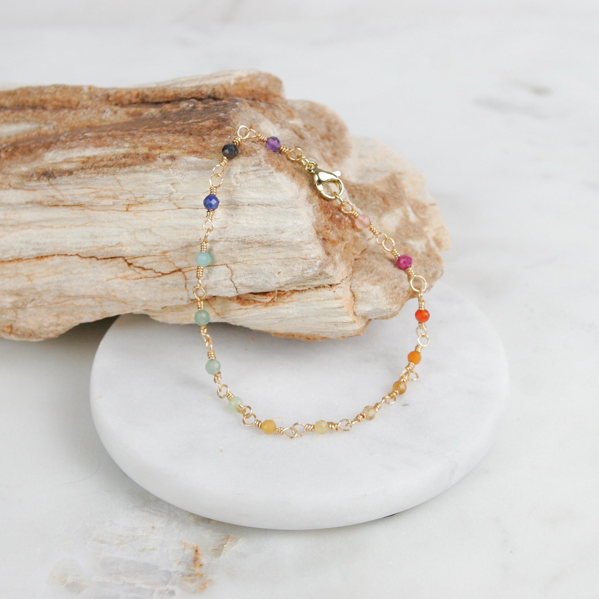 This Rainbow Wired Bracelet features vibrant rainbow tourmaline stones, expertly hand-wired with gold-filled hardware for lasting elegance. Its delicate design offers a refined, lightweight accessory that complements any outfit while showcasing the natural beauty of each unique gemstone. Perfect for those who appreciate craftsmanship and subtle sophistication. 7.5 inches in length.