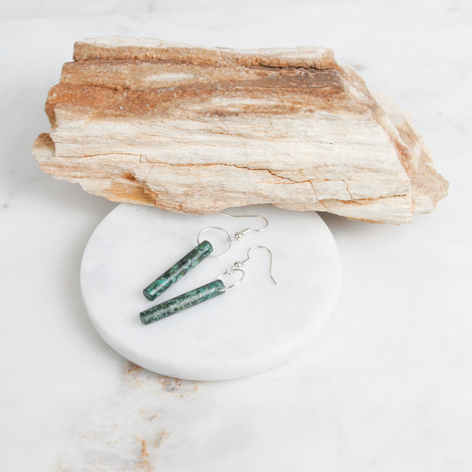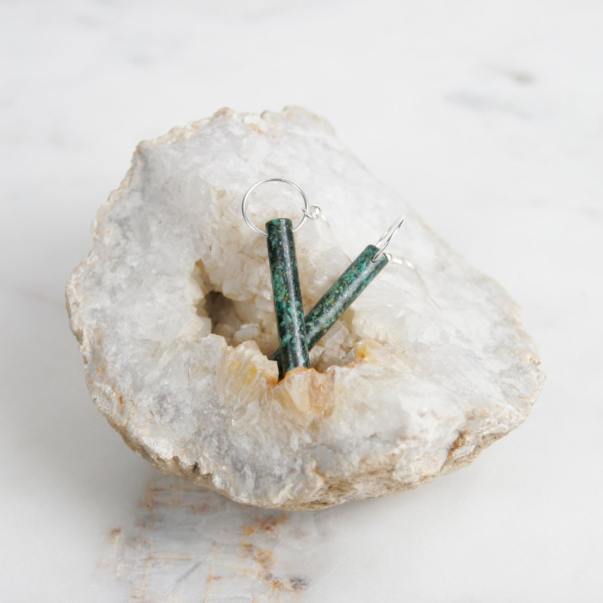 These Unique African Turquoise Earrings showcase a stunning blue-green pattern that highlights the natural beauty of the stone. Paired with sterling silver hardware, each pair offers a distinctive design that combines elegance with artisanal craftsmanship. Perfect for those seeking a refined accessory with a touch of individuality.