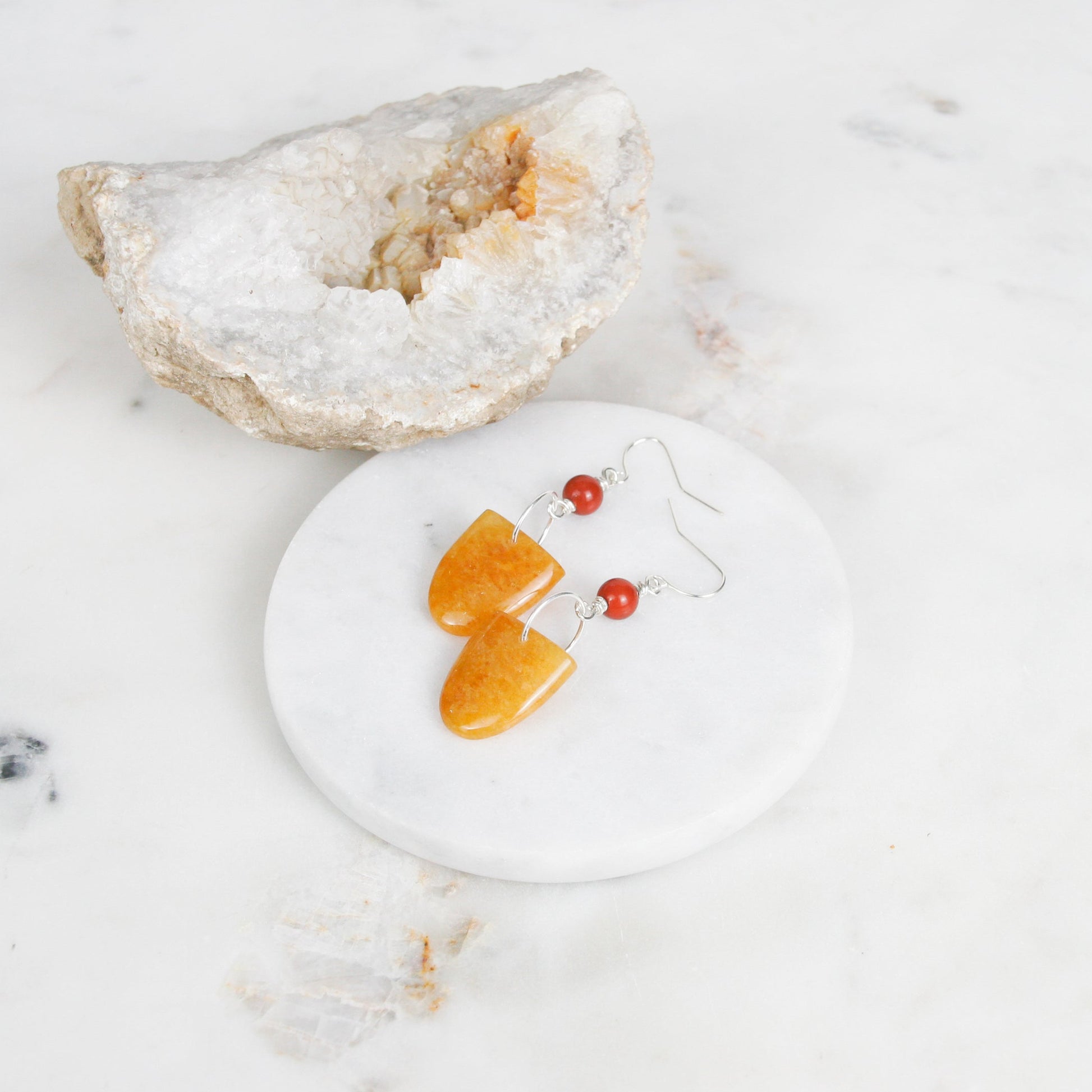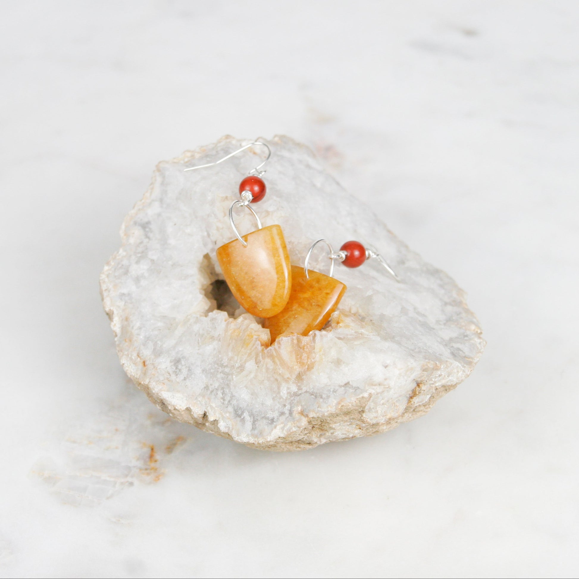 These expert-crafted earrings feature uniquely shaped yellow jade stones paired with vibrant red jasper beads, all accented by high-quality sterling silver hardware. Their distinctive combination offers both visual intrigue and lasting durability, making them a refined yet playful addition to any jewelry collection.